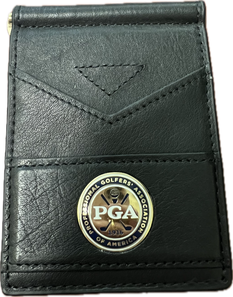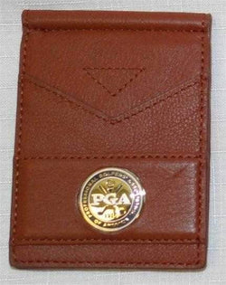 Ahead PGA Tour Embellished Leather Money Clip Wallet-Available in Black or Brown leather, Very stylish,Leather with PGA  Tour Enameled money clip and wallet, Money clip inside with pockets outside, Pockets can hold credit card, drivers license, and cards, A great gift item,  Top quality style and design, Gift boxed, Great gift item. Available in brown leather or black leather.