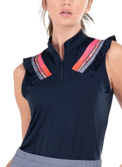 We updated the classic zip mock tank with some feminine flair. This midnight navy tank has ruched flutter cap sleeves and a chevron-V ombre stripe that creates a flattering neckline.