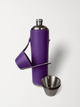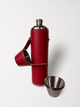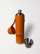 The Birdie Bottle is an 12 ounce stainless steel round flask, wrapped in leather with 4 stainless steel shot glasses held in place by a snap-on leather strap.