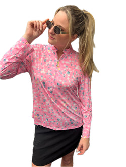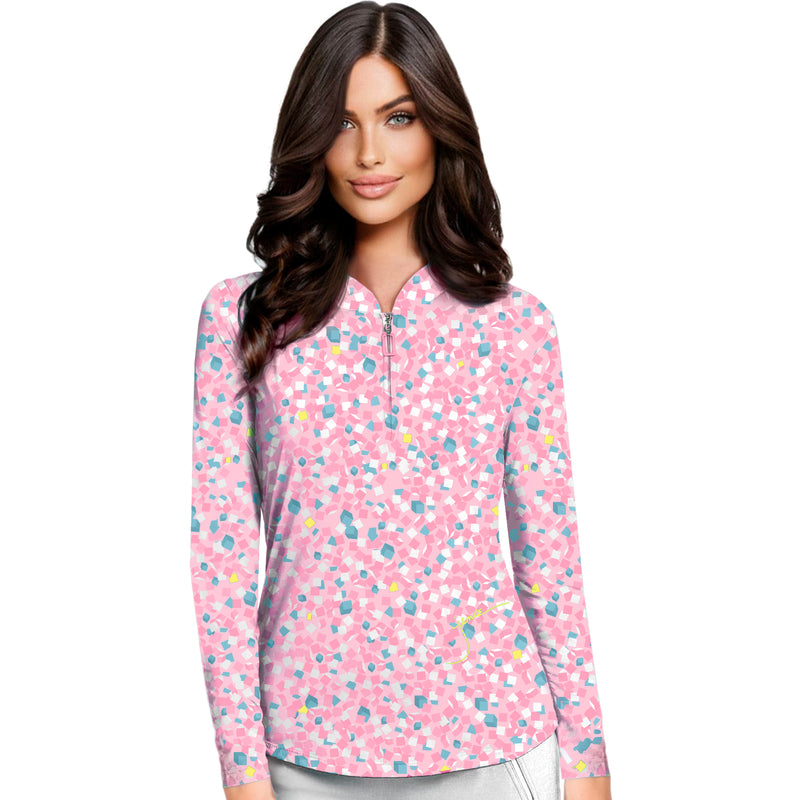 Jamie Sadock Sunsense - Pretty Angel pink and multi colored cube print , Long sleeved Sun Protection Shirt Design by Jamie Sadock Sun Sense. This shirt will keep you safe from the SUN!!! Yes that is right, UPF 50+ Ultralight Fabric keeps you protected all day during whatever outdoor activities you have planned. This thin material is so light it will literally feel like you have nothing on, made of 83% Nylon, 17% Spandex, Mock neck styled collar, and Zip Front Closure.