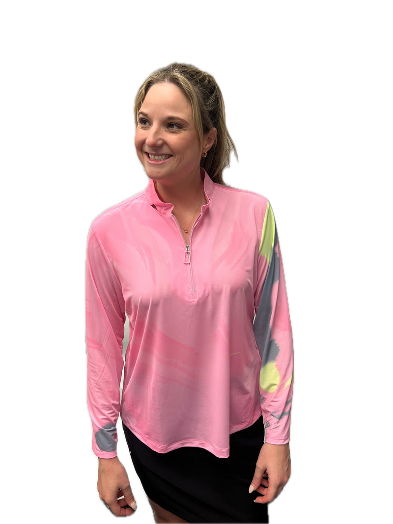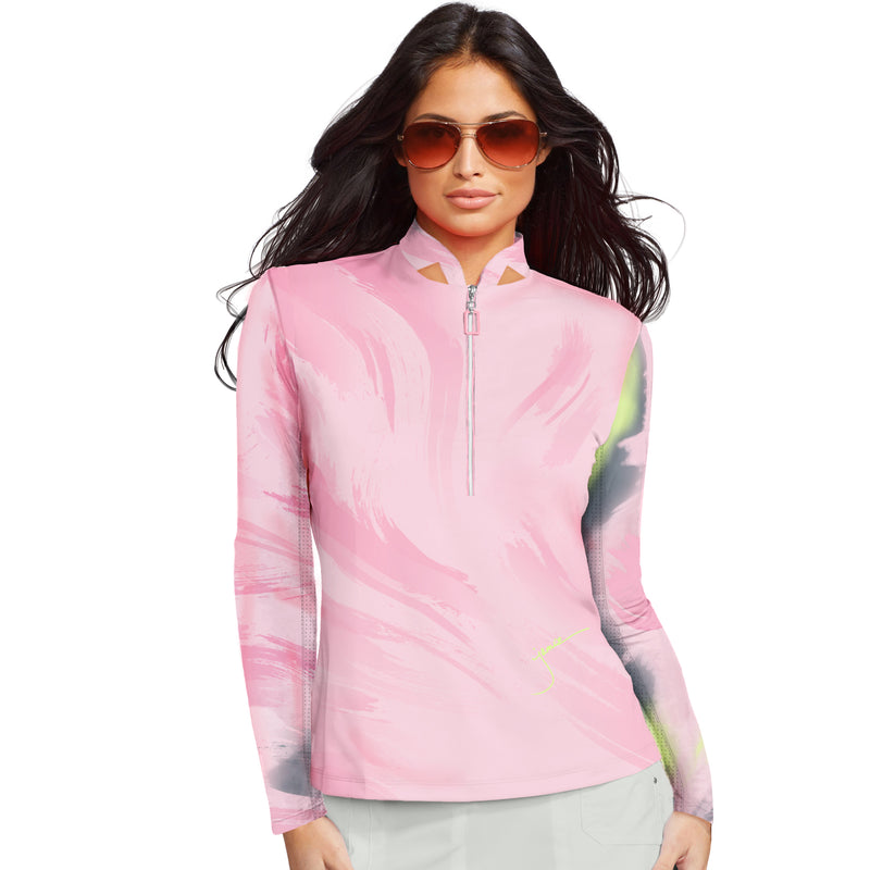 Jamie Sadock Sunsense - Pretty pink with gray, lime , Long sleeved Sun Protection Shirt Design by Jamie Sadock Sun Sense. This shirt will keep you safe from the SUN!!! Yes that is right, UPF 50+ Ultralight Fabric keeps you protected all day during whatever outdoor activities you have planned. This thin material is so light it will literally feel like you have nothing on, made of 83% Nylon, 17% Spandex, Mock neck styled collar, and Zip Front Closure.