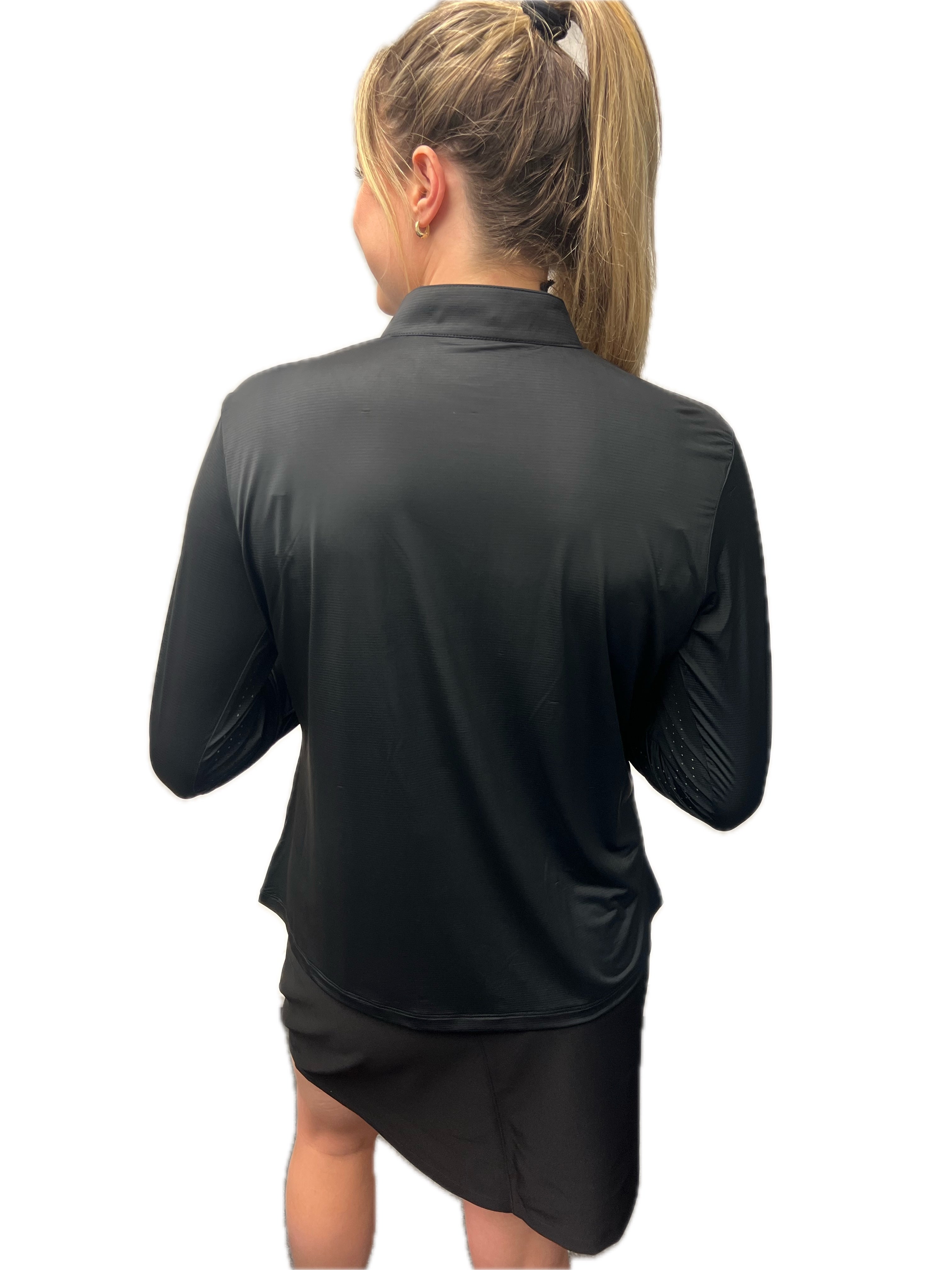Jamie Sadock Sunsense - Sharp Black with white lightning bolt , Long sleeved Sun Protection Shirt Design by Jamie Sadock Sun Sense. This shirt will keep you safe from the SUN!!! Yes that is right, UPF 50+ Ultralight Fabric keeps you protected all day during whatever outdoor activities you have planned. This thin material is so light it will literally feel like you have nothing on, made of 83% Nylon, 17% Spandex, Moc neck styled collar, and Zip Front Closure.